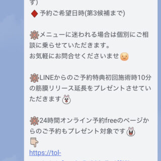 公式LINEではどのコースが今のお悩みに合っているか相談しながらお得に、しかも安心してご予約が取れます。