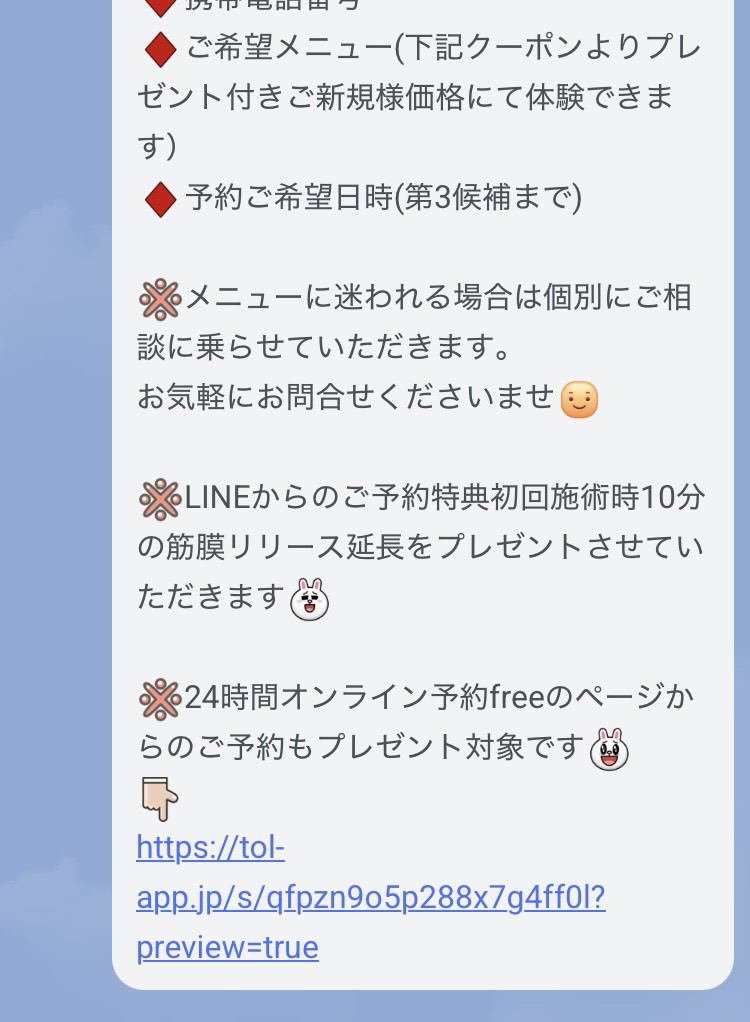 公式LINEではどのコースが今のお悩みに合っているか相談しながらお得に、しかも安心してご予約が取れます。