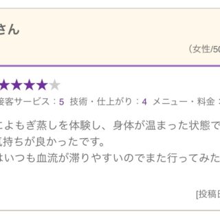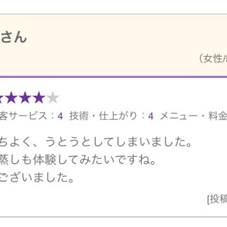 とても気持ちよく、うとうとしてしまいました。 次はよもぎ蒸しも体験してみたいですね。 ありがとうございました。