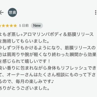久しぶりによもぎ蒸しを体験し、身体が温まった状態での筋膜リリースは気持ちが良かったです。 寒い季節はいつも血流が滞りやすいのでまた行ってみたいと思いました。