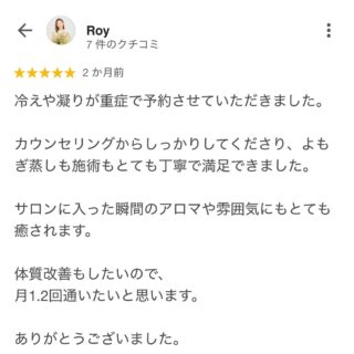冷えや凝りが重症で予約させていただきました。 カウンセリングからしっかりしてくださり、よもぎ蒸しも施術もとても丁寧で満足できました。 サロンに入った瞬間のアロマや雰囲気にもとても癒されます。 体質改善もしたいので、 月1.2回通いたいと思い...