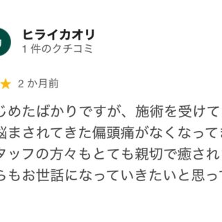 通いはじめたばかりですが、施術を受けてはじめて長年悩まされてきた偏頭痛がなくなってきました。スタッフの方々もとても親切で癒されます。これからもお世話になっていきたいと思っています。