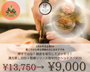寒くなってきて首肩が縮こまっていて、タートルネックなどを着る機会も多くなって温かかった時より首コリからの頭痛になっている方も多くなってきました。そこでよもぎ蒸しで深部が温まってからの、背中全体の筋膜リリース付のヘッドスパを受けていただくと楽になられるので、今月はこちらもお年玉クーポンとさせていただきます。