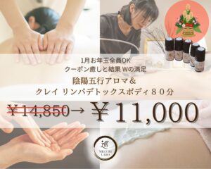 さて、12月のスタッフ皆とのミーテイングで陰陽五行アロマを使ったクレイパックつのデトックスボディが皆が受けたい受けたいと大人気で、巡りラボのお客様でまだクレイ未体験の方も多いのでは?となり、知っていただくためにもこちらを体験していただきたいとなって、1月は全員OKのお年玉クーポンとさせていただきました。
