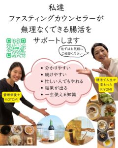 いきなりファステイングをするのが不安な方にも寄り添った無理なくできる腸活をご提案させていただけます。置き換えプログラムや1日だけのファステイングや最近中井がはまっている24時間ファステイングなど、無理なく腸の善玉菌を増やして健康に近づける方法もありますのでお気軽にお声をおかけください。