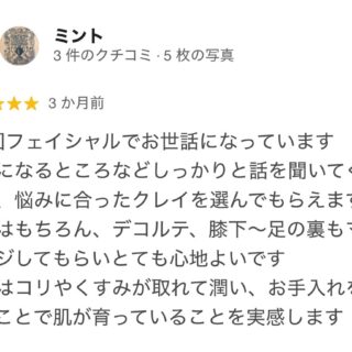 月1回フェイシャルでお世話になっています 今気になるところなどしっかりと話を聞いてくださり、悩みに合ったクレイを選んでもらえます お顔はもちろん、デコルテ、膝下〜足の裏もマッサージ...